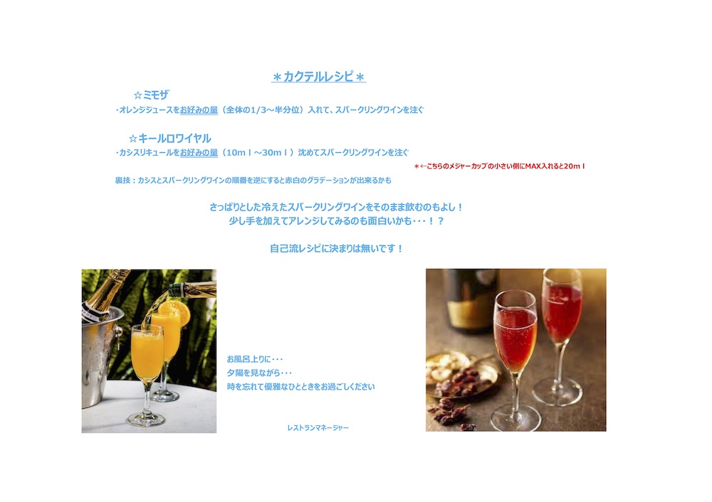ラウンジでご提供させていただいているドリンクで、自分流のオリジナルカクテルを作ってみられてはいかがでしょうか?レシピをご紹介いたします!