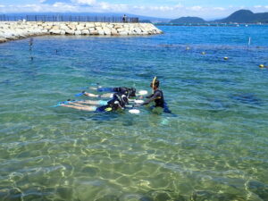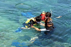 マスクを用いて水面下をクリアに覗き、シュノーケルを用いて顔を水面につけた状態で楽に呼吸することができます。楽しく遊びながらインストラクターと一緒に海を体感していただきますので、8歳くらい以上の健康な方からお気軽にご参加いただけます。